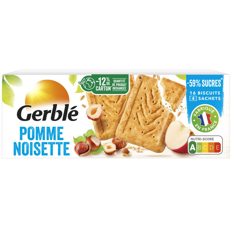 Ingrédients - Farine de BLE 68,6%, huile de colza, sirop de sucres issu de fruits, jus de pomme concentré 5,3%, NOISETTES torréfiées 5,3%, germe de BLE 5,2%, fibres de chicorée, extrait de malt d'ORGE, arôme naturel de pomme, émulsifiant : lécithines, poudres à lever (carbonates de potassium, tartrates de potassium), amidon de BLE, vitamines (E, PP, B2, B6, B1, B9). Fabriqué dans un atelier qui utilise AUTRES FRUITS A COQUE, LAIT, LUPIIN, MOUTARDE, OEUF, SESAME, SOJA