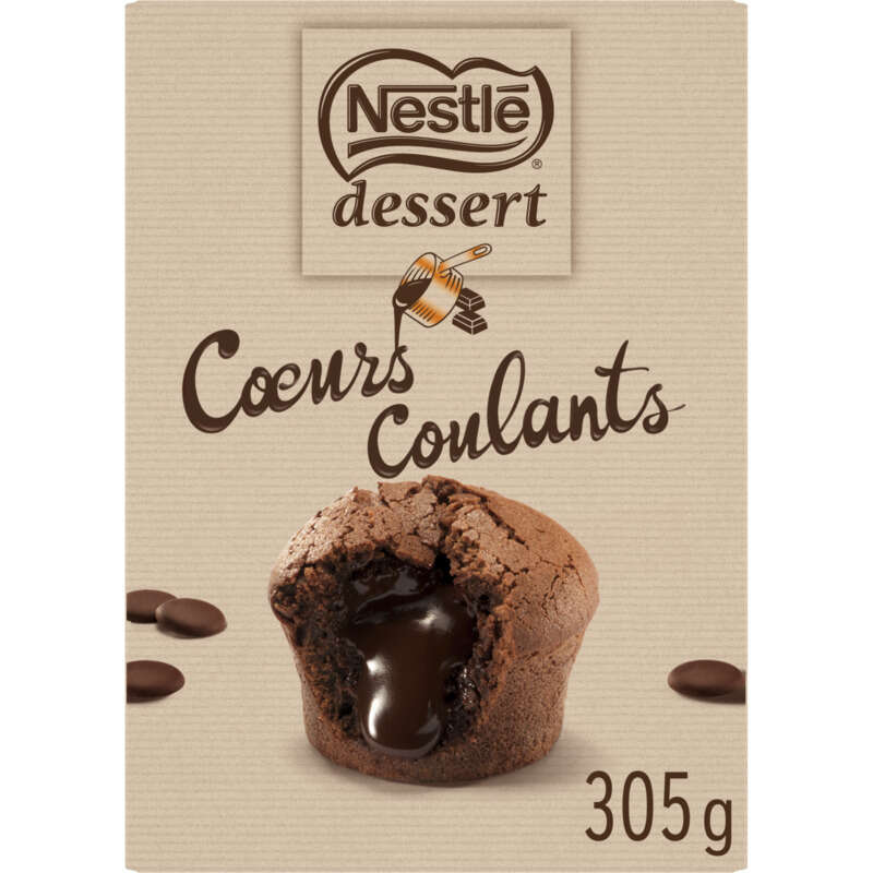 Ingrédients - Ingrédients : Sachet de chocolat noir supérieur à 53% de cacao (175 g) : sucre, pâte de cacao¹, beurre de cacao¹, émulsifiant (lécithines), arôme naturel de vanille. Sachet de préparation pour cœurs coulants (130 g) : farine de BLÉ, sucre. Peut contenir : LAIT. ¹Bilan massique certifié Rainforest Alliance. www.ra.org/fr. Pour soutenir une production plus durable du cacao, Nestlé achète une quantité de cacao certifiée Rainforest Alliance équivalente à celle nécessaire pour ce produit.